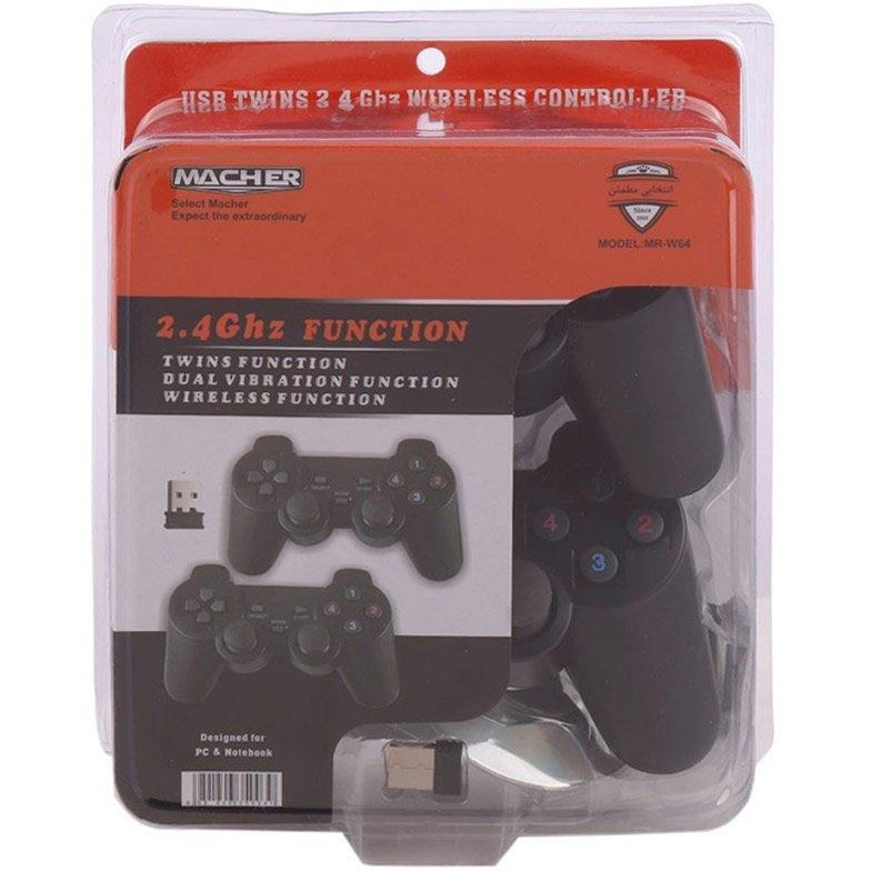 دسته بازی مچر مدل MR-W64 برای کامپیوتر و نت بوک طراحی شده است که دارای دو دسته بازی بی سیم است و با رابط USB متصل می شود. این دسته ی بازی از 10 کلید اصلی، 4 کلید روی شانه و 3 کلید Mode/Select/Start تشکیل شده است. این دسته های بازی شوک دار هستند که دارای اهرم هایی روی دسته اند که جهت حرکت را بهتر و راحت تر به رایانه انتقال می دهند و در بعضی از بازی ها در شرایط خاص به لرزش در می آیند و موجب ایجاد هیجان مضاعف در هنگام بازی می شوند. فرکانس این دسته بازی مچر 2.4Ghz می باشد. این دسته از طراحی ارگونومیک برخوردار است که خوش دست بودن و کارایی بهتر را برای کاربر فراهم می کند. این دسته ها چراغ LED و همچنین کنترل دیجیتال و آنالوگ با دکمه Mode را دارا می باشند. منبع تغذیه این دسته های بازی باتری نیم قلم (AAA) است. دسته بازی مچر مدل MR-W64 از سیستم عامل های Windows 98/2000/XP/2003/VISTA/7 پشتیبانی می کند.