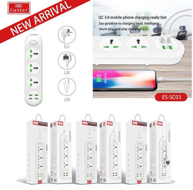 کمپانی ارلدام محصولی دیگر در رابطه با تسهیل زندگی روزمره روانه بازار نموده است، این محصول با دارا بودن طراحی زیبا و پیروی از سبک مینیمالیستی و کیفیت ساخت بالا می تواند آسایش و امنیت را برای شما به ارمغان بیاورید. در واقع محصولی برای شارژ و برق رسانی به دستگاه های مختلف است. این چند راهی در واقع، پریز برق را به سه راهی تبدیل کرده و شما می توانید سه دستگاه را به طور همزمان به آن متصل نمایید. پریزهای به کار رفته روی آن دارای درپوش محافظ کودک جهت ایمنی بیشتر است. از دیگر ویژگی های آن، دوشاخه سازگار با پریزهای ایران است در واقع بدون نیاز به تبدیل 3 به 2 می توانید از آن استفاده نمایید. با داشتن چهار پورت خروجی USB می توانید تنها با استفاده از یک کابل شارژ، گوشی، تبلت، پاوربانک و غیره را شارژ نمایید. از مهمترین ویژگی های این چندراهی قابلیت شارژ سریع گوشی است یرا دارای فناوری شارژ سریع QC3.0 است. روی دستگاه کلید قطع و وصل بسیار کارآمد و ایمن، با ساختاری ایمن وجود دارد. شما می توانید با استفاده از این دستگاه بر روی میز کار خود ضمن اتصال دستگاه های الکتریکی به یک چندراهی، از پورت های USB آن برای شارژ کلیه دستگاه هایی که کابل شارژ آن ها از پورت USB پشتیبانی می کند بهره ببرید.