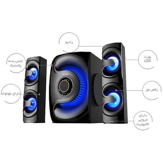 اسپیکر دسکتاپ مکسیدر مدل FY308 یکی از محصولات باکیفیت این کمپانی میباشد که از امکانات و ویژگیهای مطلوبی برخوردار است. استفاده از پلاستیک در ساختار بدنه سبب شده است که این محصول تنها 948 گرم وزن داشته باشد که امکان حمل آسان را به کاربر ارائه می دهد. اسپیکر از یک سابووفر قدرتمند و دو بلندگوی باکیفیت تشکیل شده است؛ همچنین دارای ابعاد مناسب 90×100×350 میلیمتری است که میتواند بسیاری از مشکلاتی که بر اثر کمبود فضای کافی بوجود میآید را رفع کند. هنگام روشن کردن اسپیکر دسکتاپ مکسیدر مدل FY308، یک نورپردازی بسیار زیبا در قسمت سابووفر و بلندگوها مشاهده میشود که میتواند نظر هر بینندهای را متوجه خود سازد. یکی از راههای برقراری ارتباط با این دستگاه استفاده از بلوتوث میباشد؛ پشتیبانی از بلوتوث نسخه 5.0 باعث شده است تا کاربران بتوانند اتصالی پایدار با سرعتی مناسب و بدون قطعی تا برد 10 متری داشته باشند. افزون بر اتصال وایرلس از طریق بلوتوث، یک جک سه و نیم میلیمتری صدا نیز برای اسپیکر مکسیدر مدل FY308 تعبیه شده است که کاربران میتوانند با متصل کردن گوشی و یا لپتاپ خود از طریق کابل AUX بصورت مستقیم به این دستگاه، صدایی بسیار باکیفیت را دریافت کنند. قابلیتهای مختلفی برای اسپیکر مکسیدر در نظر گرفته شده است که هر کدام امکانات گوناگونی را در اختیار کاربران قرار میدهند. یکی از قابلیتهای مهم موجود در این محصول وجود یک درگاه USB و یک اسلات کارت Micro SD میباشد. این ویژگی به شما اجازه میدهد تا بتوانید موزیکهای مورد علاقهی خود را از طریق فلش USB و یا کارت Micro SD به راحتی و با کیفیت بالا پخش کنید. تعبیهی دکمههای کنترل و پخش موسیقی روی قسمت جلویی سابووفر و همچنین پشتیبانی از رادیو FM از دیگر ویژگیهای حائز اهمیتی است که باعث محبوبیت بیشتر این محصول شده است. اسپیکر مکسیدر مدل FY-308 دارای حداکثر توان خروجی 3800 وات و فرکانس پاسخگویی بین 40 هرتز تا 20 کیلوهرتز است و میتواند صدایی قوی و باکیفیت را در اختیار کاربران قرار دهد. یک ریموت برای کنترل راحتتر و بهتر اسپیکر نیز در نظر گرفته شده است که استفاده از این محصول را به امری بسیار ساده تبدیل میکند.