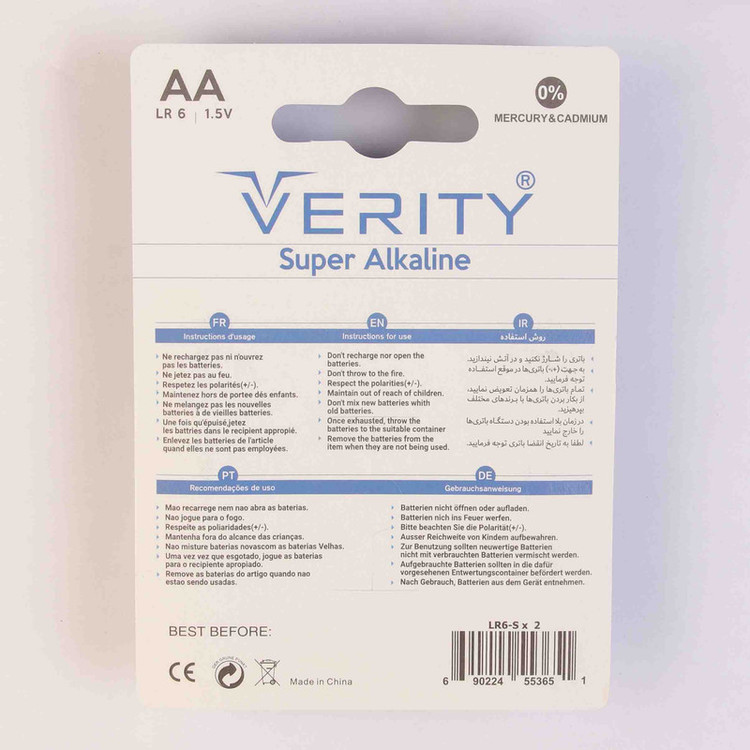 برند انگلیسی وریتی (ساخت چین ) باتری هایی با تکنولوژی سوپر آلکالاین تولید کرده که دارای عمری بالاتر نسبت به سری آلکالاین و اولترا آلکالاین میباشد . این باتری دوستدار محیط زیست ،بدون جیوه و کادمیوم میباشند . باتری های سوپر آلکالاین قلمی وریتی مناسب دسته های بازی - دستگاه فشار و دستگاه های پر مصرف میباشند...