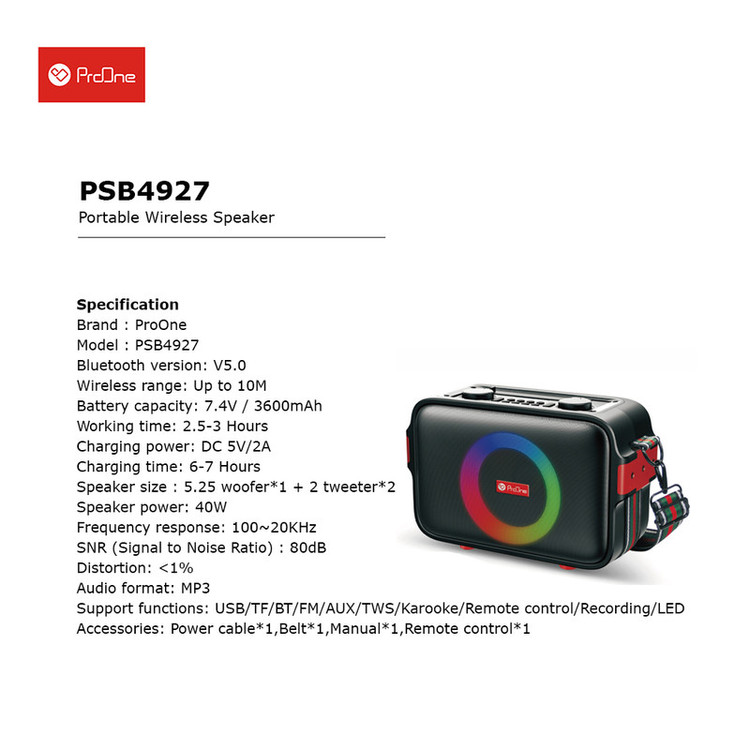 همیشه جای یک موسیقی در مسافرت،طبیعت گردی و دورهمیهای دوستانه خالی است به همین دلیل اکثریت افراد با خرید اسپیکرهای بلوتوثی قابل حمل، کار خود را راحت میکند تا همیشه موسیقی در هر محفلی پابرجا باشد. همچنین با افزایش علاقهمندی مصرف کنندگان به کالاهای صوتی، اسپیکرها با مدلها و قابلیتهای متنوعی تولید شدهاند. برند پرووان، یکی از پیشتازان تولید لوازم جانبی دیجیتال، با بررسی نیاز مردم نسبت به طراحی و تولید اسپیکر بلوتوثی قابل حمل PSB4927 اقدام کرده است . این اسپیکر با ابعادی معادل طول 265، عرض110و ارتفاع 165میلی متر طراحی و تولید شده است و وزن کل اسپیکر معادل 2300گرم است. در قسمت بالای اسپیکر PSB4927 یک پنل کاربردی جهت قطع و وصل کردن، عقب و جلو زدن موسیقی، تغییر حالات پخش و دکمه روشن و خاموش قرار دارد. این اسپیکر دارای رادیو و میکروفون داخلی است که درصورت اتصال کارت حافظه صدای محیط را ظبط میکند.و محفظههای پورتهای اتصال USB، جک 3.5 میلیمتری صدا، شیار کارت حافظه و ورودی شارژ اسپیکر قرار دارد. قدرت این اسپیکر در مجموع 40 وات بوده و دارای باتری 3600 میلی آمپر است که بطور نرمال 3 ساعت زمان پخش موسیقی دارد و مدت زمان شارژ آن 6 ساعت است. اسپیکر زیبا و جذاب PSB4927 دارای رقص نور رنگی است که با آهنگ تم رنگی جذابی را به تصویر میکشد.ضمنا این اسپیکر پرکاربرد دارای یک بند همراه برای حمل ونقل راحت تر است.
