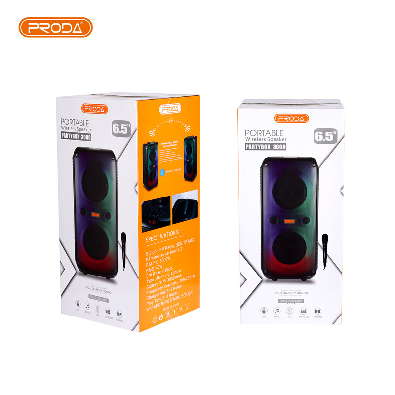 با اسپیکر قدرتمند و قابل حمل PRODA PARTY BOX 3000 میتوانید مهمانی را با صدای قدرتمند و نمایش نور پویا شروع کنید. این دستگاه با نورپردازی منحصر به فرد LED هماهنگ شده، با صدای قدرتمند و باس عمیق، برای هر مهمانی، محتوای جدیدی به ارمغان میآورد.اسپیکر PRODA PARTY BOX 3000دارای یک طراحی زیبا و چشم نواز است که میتوان آن را با یک دست حمل کرد. همراه با صدای با کیفیت با ظرفیت قدرت 20 وات با پاسخ فرکانس100 هرتز تا 20 کیلوهرتز و حساسیت 85دسی بل همراه است . اسپیکرهای PRODA PARTY BOX 3000یک اسپیکر بلوتوثی با چراغهای LED زیبا و سیستم ارتقا یافته مدل قبلی این برند است. به راستی PRODA BOM PARTY BOX 3000 به شما تجربه سمعی و بصری بی نظیر و همه جانبه ای میبخشد که هر مهمانی را به یک اثر هنری تبدیل میکند. هر نوع موسیقی با نمایش نور پویا بهتر است. نمایش نور پویا که با ضربان همگام سازی میشود، رنگهای همگام با ضربات را به حرکت در میآورد، در حالی که استروبها و الگوهای قابل تنظیم چشمان شما را خیره میکند. این یک تجربه شنیداری و بصری منحصر به فرد است که هر مهمانی را به یک اثر هنری تبدیل مینماید. همچنین میتوانید مهمانی را تمام روز تأمین کنید.از سویی دیگر، با ورودیهای میکروفون و گیتار، میتوانید استعدادهای خود را هنگام آواز خواندن و بازی نشان دهید PRODA PARTY BOX 3000 لحظات خوشی را برای شما به ارمغان میاورد.