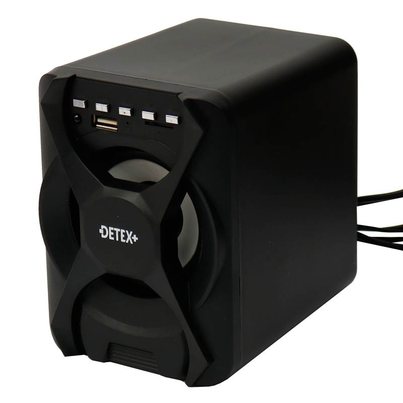 بلندگو DS-99 از برند دیتکس پلاس متشکل از یک ساب ووفر و دو بلندگو می باشد که به صورت رومیزی در کنار کامپیوتر، تلوزیون و… مورد استفاده قرار می گیرد و از اتصال با سیم و بی سیم پشتیبانی می کند. اسپیکر Detex+ DS-99 از طراحی ساده با بدنه ای پلاستیکی بهره می برد و از سایز نسبتا کوچکی برخوردار است که برای قرار دادن در مکان هایی که فضا به اندازه کافی وجود ندارد بسیار مناسب می باشد. بر روی بدنه اسپیکر سه تیکه، کلید های برای تغییر وضعیت عملکرد دستگاه نظیر تغییر نوع مود، ولوم صدا، پخش و توقف موزیک و… قرار گرفته است که دسترسی به آنها به سادگی صورت می گیرد. همچنین این اسپیکر با پشتیبانی از ریموت کنترل استفاده راحت تر و اعمال تنظیمات را از راه دور برای کاربران فراهم می نماید و از طریق اتصال به پورت USB انرژی مورد نیاز خود را تامین می کند. اسپیکر رومیزی Detex+ DS-99 به لطف مجهز بودن به بلوتوث به انواع گوشی موبایل، تبلت، تلوزیون، لپ تاپ و… به صورت بی سیم تا شعاع ۱۰ متری متصل می شود و صدایی شفاف، بدون قطعی و نویز را ارائه می دهد. در صورتی که گجت مورد نظر شما فاقد تکنولوژی بلوتوث باشد می توانید به آسانی از طریق کابل AUX آن را به این اسپیکر متصل نموده و از شنیدن موسیقی مورد علاقه تان لذت ببرید. علاوه بر این بر روی بدنه اسپیکر سه تکه بلوتوث دار دیتکس پلاس یک پورت USB و درگاه کارت حافظه هم تعبیه شده که امکان اتصال حافظه فلش و رم به صورت مستقیم (با ظرفیت حداکثر ۳۲ گیگابایت) را برای کاربران امکان پذیر می نماید. قدرت خروجی ساب ووفر اسپیکر کامپیوتر +Detex برابر با ۵ وات بوده و توان هر یک از اسپیکر های آن برابر با ۳ وات می باشد، که در کنار آمپدانس ۴ اهم، حساسیت سیگنال به نویز ۵۸ دسی بل و فرکانس پاسخگویی داینامیکی ۲۰ هرتز الی ۲۰ کیلو هرتز جزئیات موسیقی را با کیفیت بالایی پخش می کند، اما از حجم خروجی صدا متوسطی برخوردار است.