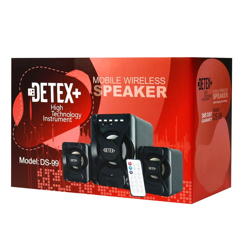 بلندگو DS-99 از برند دیتکس پلاس متشکل از یک ساب ووفر و دو بلندگو می باشد که به صورت رومیزی در کنار کامپیوتر، تلوزیون و… مورد استفاده قرار می گیرد و از اتصال با سیم و بی سیم پشتیبانی می کند. اسپیکر Detex+ DS-99 از طراحی ساده با بدنه ای پلاستیکی بهره می برد و از سایز نسبتا کوچکی برخوردار است که برای قرار دادن در مکان هایی که فضا به اندازه کافی وجود ندارد بسیار مناسب می باشد. بر روی بدنه اسپیکر سه تیکه، کلید های برای تغییر وضعیت عملکرد دستگاه نظیر تغییر نوع مود، ولوم صدا، پخش و توقف موزیک و… قرار گرفته است که دسترسی به آنها به سادگی صورت می گیرد. همچنین این اسپیکر با پشتیبانی از ریموت کنترل استفاده راحت تر و اعمال تنظیمات را از راه دور برای کاربران فراهم می نماید و از طریق اتصال به پورت USB انرژی مورد نیاز خود را تامین می کند. اسپیکر رومیزی Detex+ DS-99 به لطف مجهز بودن به بلوتوث به انواع گوشی موبایل، تبلت، تلوزیون، لپ تاپ و… به صورت بی سیم تا شعاع ۱۰ متری متصل می شود و صدایی شفاف، بدون قطعی و نویز را ارائه می دهد. در صورتی که گجت مورد نظر شما فاقد تکنولوژی بلوتوث باشد می توانید به آسانی از طریق کابل AUX آن را به این اسپیکر متصل نموده و از شنیدن موسیقی مورد علاقه تان لذت ببرید. علاوه بر این بر روی بدنه اسپیکر سه تکه بلوتوث دار دیتکس پلاس یک پورت USB و درگاه کارت حافظه هم تعبیه شده که امکان اتصال حافظه فلش و رم به صورت مستقیم (با ظرفیت حداکثر ۳۲ گیگابایت) را برای کاربران امکان پذیر می نماید. قدرت خروجی ساب ووفر اسپیکر کامپیوتر +Detex برابر با ۵ وات بوده و توان هر یک از اسپیکر های آن برابر با ۳ وات می باشد، که در کنار آمپدانس ۴ اهم، حساسیت سیگنال به نویز ۵۸ دسی بل و فرکانس پاسخگویی داینامیکی ۲۰ هرتز الی ۲۰ کیلو هرتز جزئیات موسیقی را با کیفیت بالایی پخش می کند، اما از حجم خروجی صدا متوسطی برخوردار است.