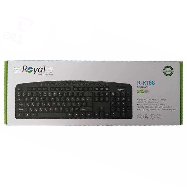 کیبورد رویال مدل R-K168 با 104 عدد کلید، به صورت سیمی و از طریق پورت USB به کامپیوتر متصل می شود. طراحی این کیبورد ساده و شیک بوده و برای استفاده در محل کار و یا منزل گزینه مناسبی است.
